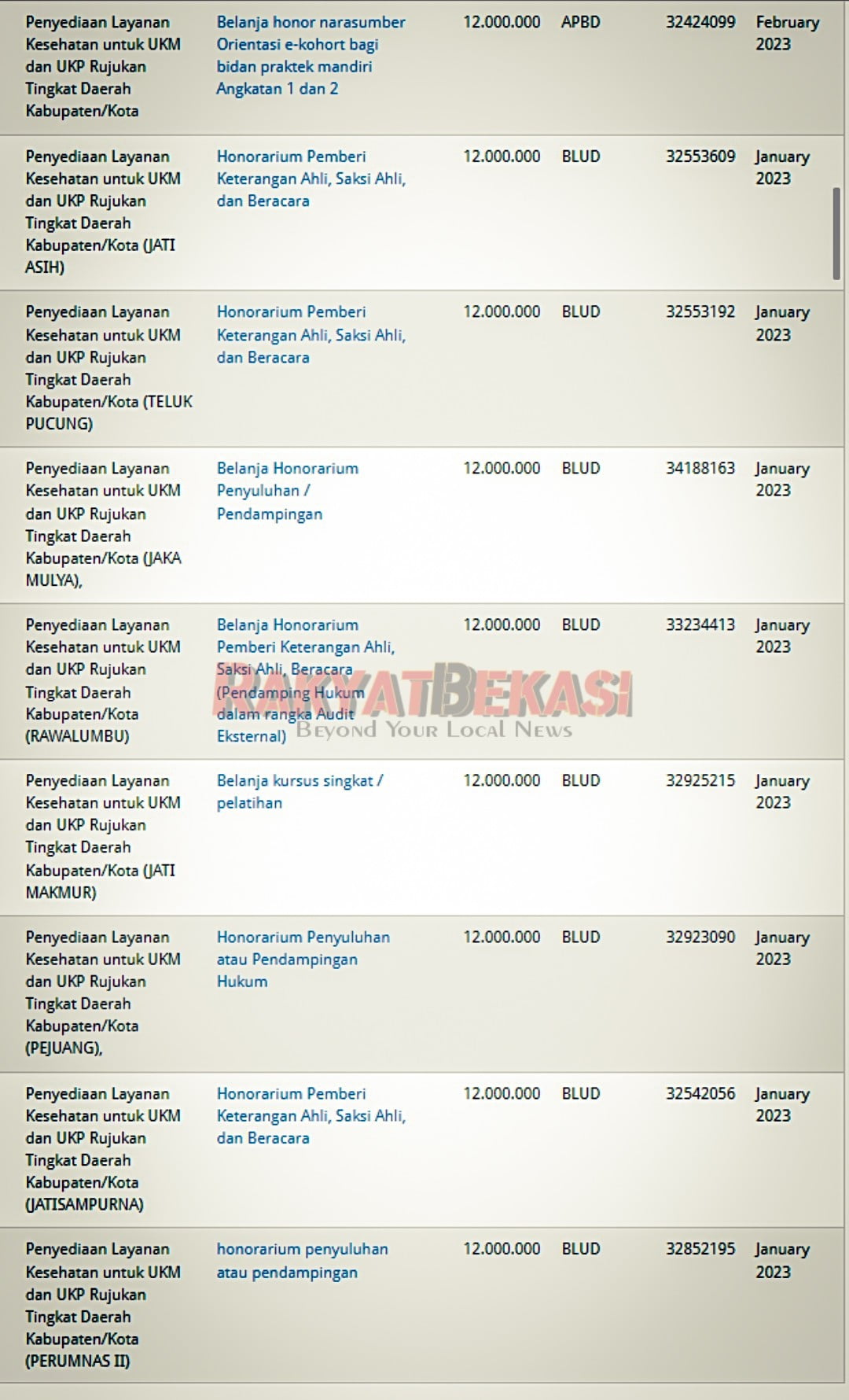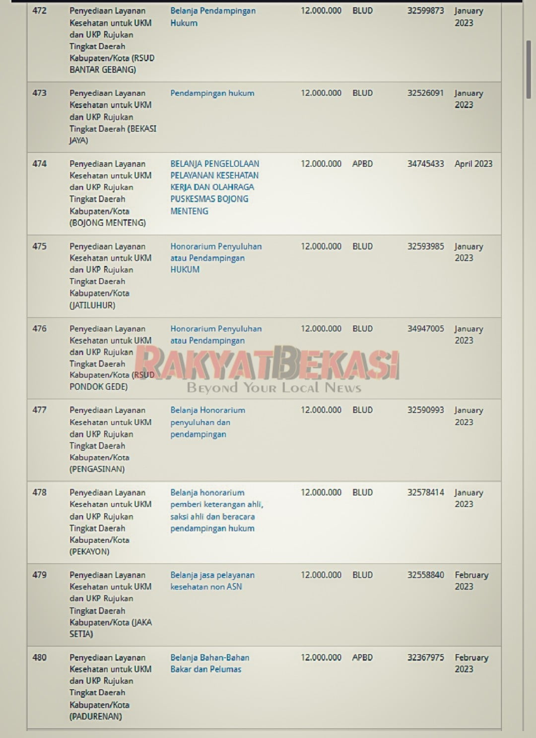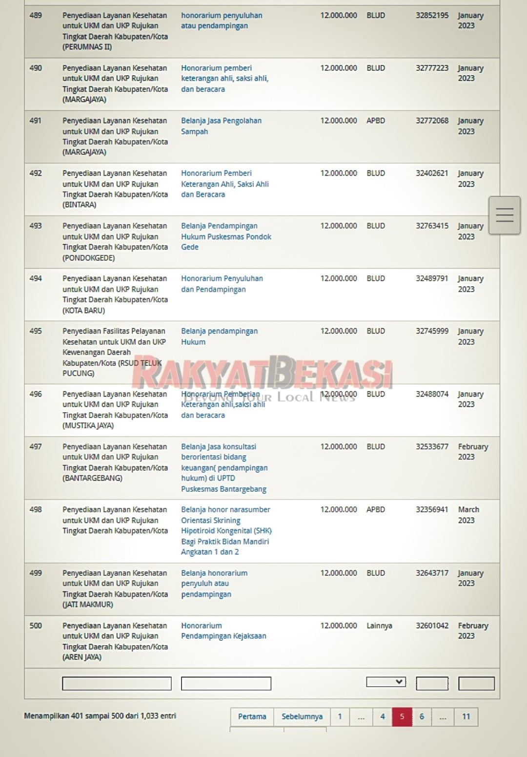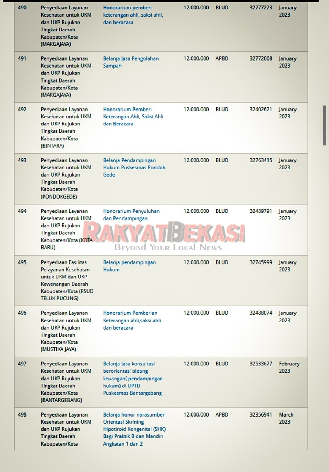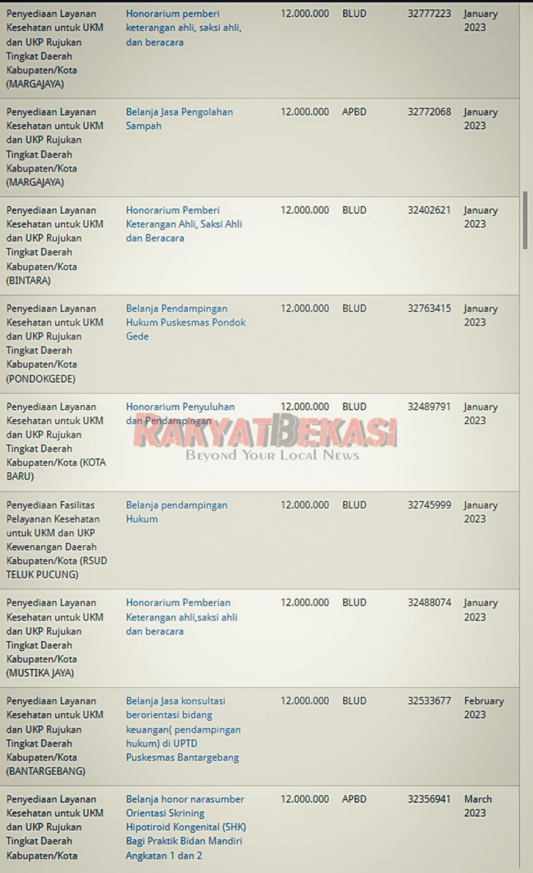 “Ya setiap bulan para kepala puskesmas ini wajib setor Rp1 juta ke koordinator tim hukum tersebut atas perintah Kadinkes Kota Bekasi. Bayangkan kalau 35 kepala puskesmas dan empat kepala rumah sakit setor setiap bulan masing-masing Rp1 juta. Sementara puskesmas-puskesmas ini tak pernah mendapat bantuan hukum atau apapunlah namanya. Itu kan sama saja dikutip uang Rp39 juta per bulan dari mereka,” ujar sumber seperti dikutip oleh koranbekasi.id.Terkait “Upeti” puluhan Puskesmas dan rumah sakit yang ada di Kota Bekasi kepada sebuah firma hukum selama tahun 2023, pernah dilaporkan oleh Mas Tri (Masyarakat Terorganisir) kepada Kejaksaan Negeri Kota Bekasi pada Jumat (07/10/2023) yang lalu.Laporan tersebut melibatkan dugaan penyalahgunaan wewenang dan indikasi korupsi yang diduga dilakukan oleh oknum anggota Tim Percepatan Pelayanan Publik (TP3) Kota Bekasi.[irp posts=”7511″ ]Berdasarkan penelusuran redaksi rakyatbekasi, berikut “Upeti” sejuta per bulan yang dianggarkan puskesmas- puskesmas di Kota Bekasi sebesar Rp12 juta setahun.