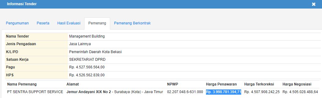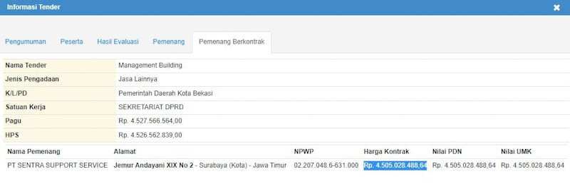 “Sekwan DPRD Kota Bekasi selaku pengguna anggaran harus mengevaluasi Perjanjian Kerja Sama dengan PT Sentra Support Service,” tegasnya.Sebagai tambahan informasi, pelaksanaan tender Management Building di Sekretariat DPRD Kota Bekasi diduga penuh dengan permainan berbau kolusi sehingga memenangkan PT Sentra Support Service sebagai pemenang lelang.Dugaan permainan yang berbau kolusi tersebut diduga tidak memenuhi prinsip terbuka dan bersaing, transparan, adil dan tidak diskriminatif.Hal ini terlihat dari proses lelang, meskipun terdapat 31 peserta yang mengajukan penawaran harga hanya satu perusahaan yakni PT Sentra Support Service dengan harga penawaran sebesar Rp. 3.998.781.394,71.
