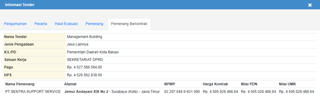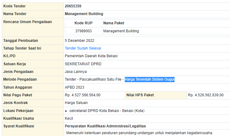 Tangkapan layar informasi tender Management Building di Sekretariat DPRD Kota Bekasi 2023.